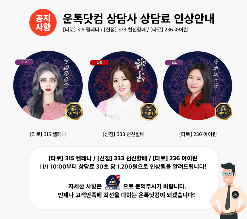 회사는 통신판매중재자로서 각 판매자(상담사)가 등록한 정보 및 거래와 상담내용에 대한 책임은 각 판매자(상담사)에게 있으며, 회사는 책임을 지지 않습니다.